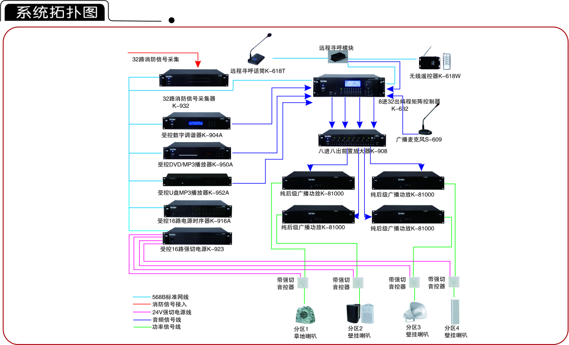5.緊急廣播:緊急事故情況發(fā)生時,能及時播放緊急廣播信息,King-Bang公共廣播系統(tǒng)的其它功能(背景音樂、一般廣播等)將被暫停,快速起到緊急疏散人群,引導(dǎo)人員疏散方向;直到緊急廣播狀態(tài)解除;