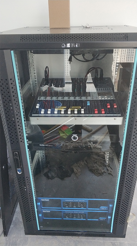 放大設備——指對經過調控設備混音輸出、信號處理后的信號進行后級功率放大設備,這里指專業功率放大器;重放設備——指將經過后級功率放大器放大的音頻信號進行電—聲轉換并釋放表現出來人耳可懂的聲頻信號的設備,這里指揚聲器;